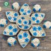 Bộ bát đĩa hoa mặt trời Hoa Mai Xanh cánh thoi được làm từ chất liệu gốm sứ cao cấp Bát Tràng, xương gốm bền chắc, họa tiết hoa Mai xanh vẽ thủ công nổi bật trên nền men trắng ngà.